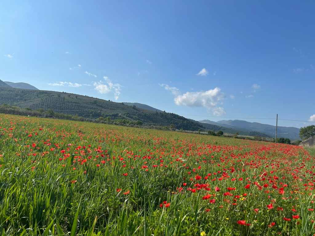 Der Weg schlängelt sich angenehm nach oben. Gut für meinen Körper. Dann komme ich an riesigen Mohnblumenfeldern vorbei und bin in einem Bild von Monet, wo er den unglaublichen Augenblicks eines Sommertages mit leuchtenden Farben festhielt.