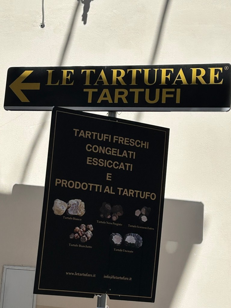 Dann sehe ich auf einem Feld Männer, die einen neuen Strommast errichten. Sie heben ihre Kaffeebecher und winken mir zu. Ich geselle mich zu ihnen, schlürfe das heisse schwarze Gebräu und nicke in die Runde. Manchmal braucht es einfach keine Worte. Wenn man von Italien spricht heisst es immer La dolce vita. Ich füge für mich nach meinen Tagen hier das Wort herzlich dazu: La dolce e affettuosa vita. Ich komme an einer Trüffelfabrik vorbei und im nächsten Ort bietet jeder Laden, jedes kleine Restaurant Speisen mit Trüffel an.